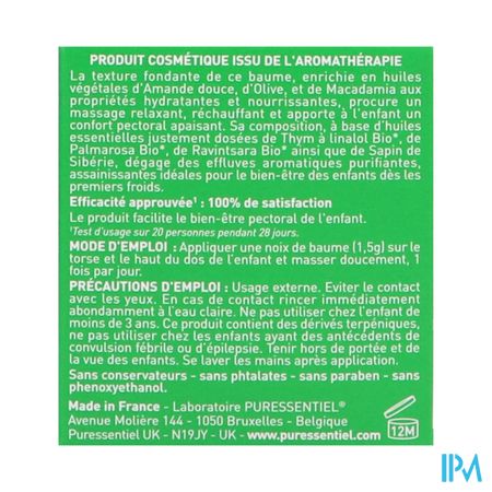 De zachte textuur van deze balsem, verrijkt met hydraterende en voedende plantaardige oliën (Zoete amandel, Olijf, Macadamia), zorgt voor een ontspannende, verwarmende massage en verzacht het borstcomfort van het kind. De samenstelling op basis van nauwkeurig gedoseerde essentiële oliën van Biologische Tijm Linalol, Biologische Palmarosa, Biologische Ravintsara en Siberische Den geeft reinigende en zuiverende aromatische dampen vrij, die ideaal zijn voor het welzijn van het kind, al vanaf de 1ste koude dagen.