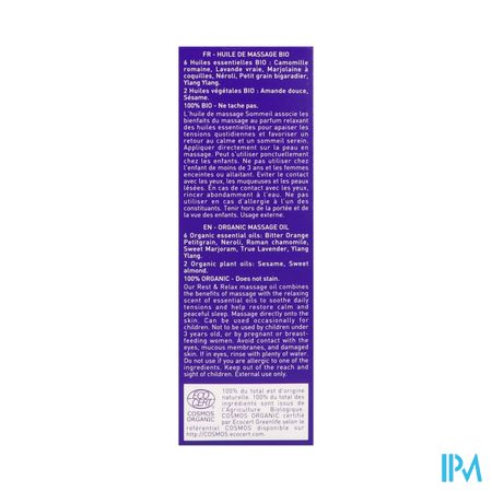 De massage-olie Ontspanning combineert de weldaden van de massage met de eigenschappen van de essentiële oliën van Lavendel, Neroli, Roomse Kamille, Marjolein, Bitter Orange en Ylang-ylang die de dagelijkse spanningen kalmeren, rust brengen en een serene slaap bevorderen..