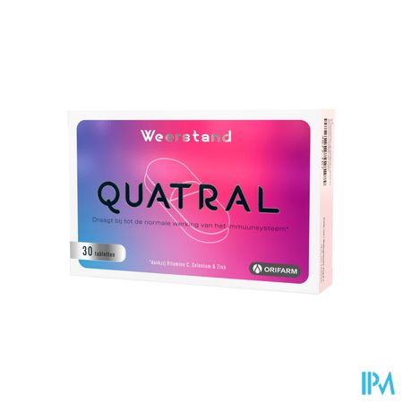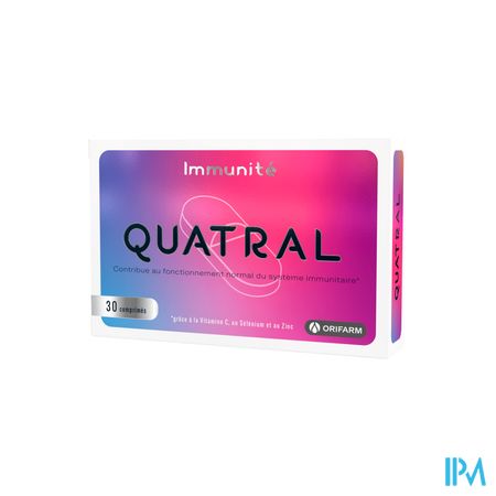 QUATRAL bevat 1 tablet met vitamines C, E, seleen, zink en bioflavonoïden. Elke cel in ons lichaam heeft, om optimaal te functioneren, immers nood aan deze stoffen en bevordert op die manier in hoge mate de levenskwaliteit. Bio-flavonoïden zijn antioxidanten die worden gewonnen uit natuurlijke citrusvruchten.