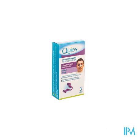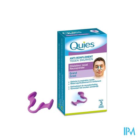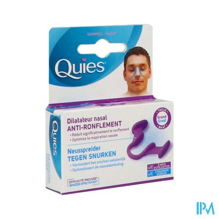 Met de Quies neusverwijder kunnen de neusgaten van de snurker lichtjes verwijd worden zodat de luchtdoorstroming gemakkelijker wordt en de ademhaling door de mond, die vaak samengaat met snurken, wordt vermeden. Eenvoudig te gebruiken, herbruikbaar gedurende 3 maanden. Verkrijgbaar in klein/gemiddeld en groot formaat. Vanaf 12 jaar oud. Deze medische hulpmiddelen zijn gereglementeerde gezondheidsproducten die in het kader van deze verordening van het CE-merkteken zijn voorzien. Lees de instructies zorgvuldig. Vraag uw apotheker om advies.