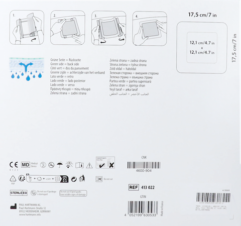 Reinig de wond met een fysiologische zoutoplossing of volgens de instructies van een arts.• Kies de geschikte kompresmaat voor de wond. Het wondkompres moet ongeveer 1 tot 2 cm over de randen van de wond vallen. Het absorberende groene kompres mag niet worden bijgeknipt. De doorzichtige rand mag worden bijgeknipt, bijvoorbeeld om het kompres aan te passen aan een holle/ronde vorm. • Nadat de wond is gespoeld en voordat het kompres wordt aangebracht, moet de omliggende huid worden drooggemaakt met deppers om te zorgen dat het kompres hecht. • Verwijder de twee beschermstroken. Leg het kompres met de klevende zijde op de wond, zodat de groene kant zich aan de niet-wondzijde bevindt. • Druk de kleefranden stevig aan en vermijd rimpelende randen zodat het kompres goed op zijn plaats blijft. • Er is geen extra fixatiemateriaal nodig. Indien geïndiceerd kan een drukverband worden aangebracht volgens de instructies van een arts. • Het kompres kan tot maximaal drie dagen op de wond blijven zitten, afhankelijk van de wondconditie en het opgestelde klinische protocol. • Het kompres moet worden gewisseld als dit klinisch is geïndiceerd of wanneer exsudaat de rand van het absorberende kompres bereikt.