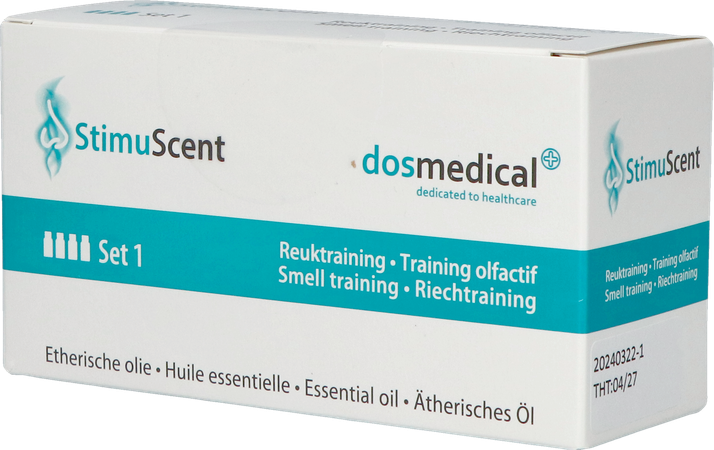 De volledige DOS Medical reuktraining bestaat uit 3 geursets, elk met 4 potjes met etherische oliën met eigen geuren:
