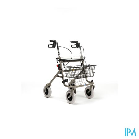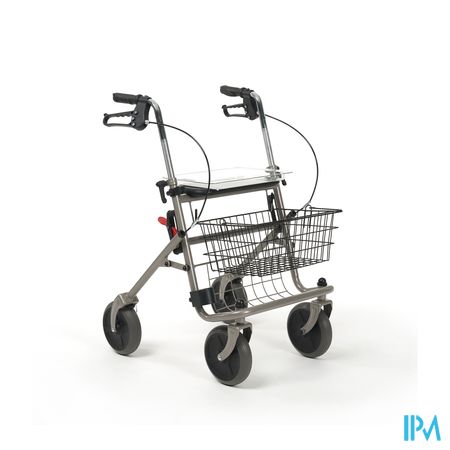 Plooibare rollator met vier wielen. Voorzien van een afneembaar metalen inkoopmandje, een plexi tablet, een zitvlak en een krukkenhouder. Multifunctionele remmen met duwhandvatten die regelbaar zijn in hoogte. Eenvoudig en snel plooibaar, ideaal voor transport.