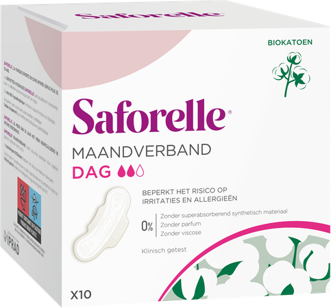 De hygiënische maandverbanden Dag zijn gemaakt uit biologisch katoen, werden klinisch getest en irriteren niet. Deze intieme bescherming garandeert een veilige absorptie en respecteert de intieme zone.
