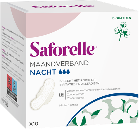 De hygiënische maandverbanden Nacht zijn gemaakt uit biologisch katoen, werden klinisch getest en irriteren niet1. Deze intieme bescherming garandeert een veilige absorptie en respecteert uw intieme zone.
