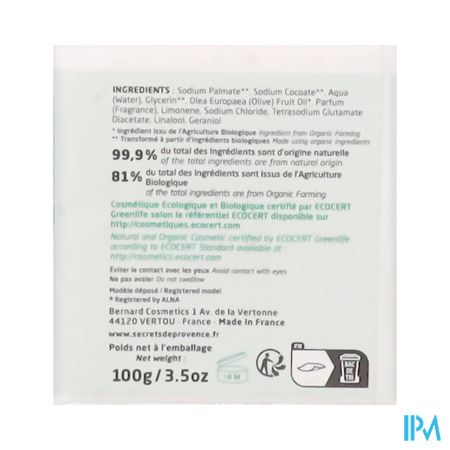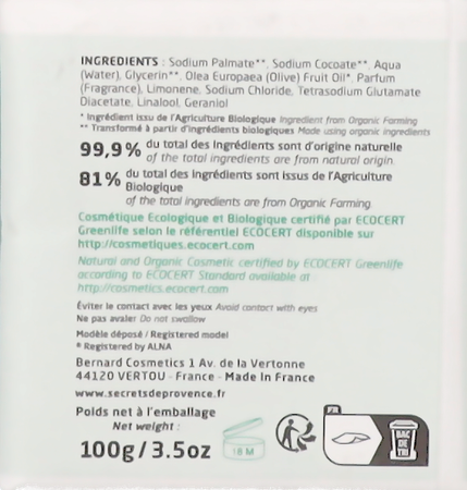 INCI-lijst: Natriumpalmaat**, Natriumcocoaat**, Aqua (Water), Glycerine**, Olea Europaea (Olijf) Fruitolie*, Parfum (Geur), Limoneen, Natriumchloride, Tetranatriumglutamaatdiacetaat, Linalool, Geraniol