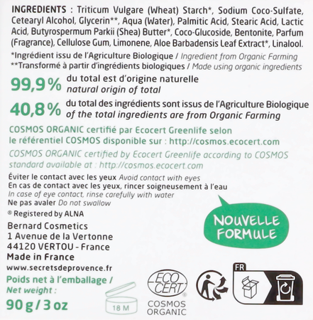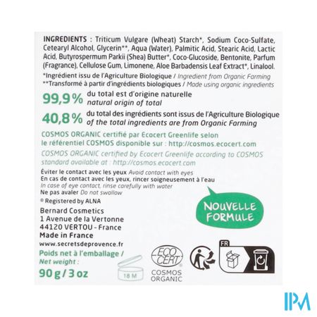 INCI-lijst: Triticum Vulgare (tarwe) zetmeel*, kaliumlaurylsulfaat, cetearylalcohol, natriumlaurylsulfaat, glycerine**, stearinezuur, palmitinezuur, aqua (water), Butyrospermum Parkii (sheaboter)*, bentoniet, parfum (geurstof), cellulosegom, limoneen, aloë barbadensis-bladextract*, melkzuur, linalool
