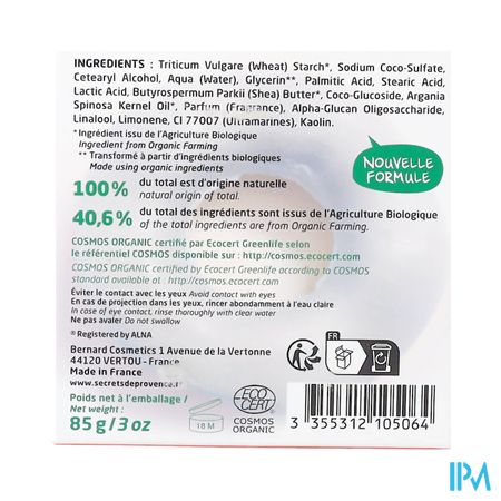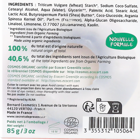 Ingrediënten: Triticum Vulgare (Tarwe) Zetmeel*, Natriumcocosulfaat, Cetearylalcohol, Aqua (Water), Glycerine**, Palmitinezuur, Stearinezuur, Melkzuur, Butyrospermum Parkii (Shea) Boter*, Coco-Glucoside, Argania Spinosa Kernelolie*, Parfum (Geur), Alfa-Glucaan Oligosaccharide, Linalool, Limoneen, CI 77007 (Ultramarijnen), Kaolien