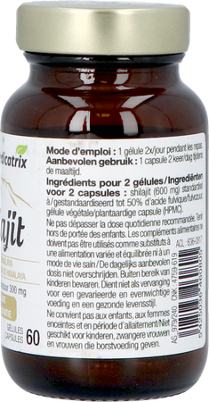 shilajit (600 mg) gestandaardiseerd tot 50% fulvozuur (300 mg), plantaardige capsule (HPMC - omhulsel). Kan maïsresten bevatten.