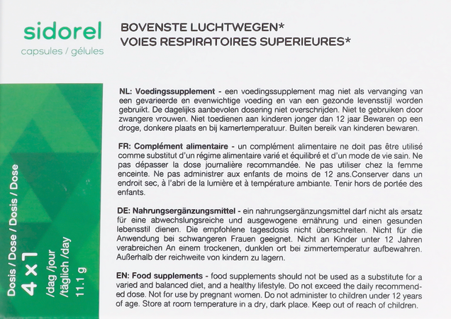 Sidorel Caps 30 is een voedingssupplement, verkrijgbaar in uw buurtapotheek of online apotheek. Neem niet meer dan de aanbevolen dagelijkse dosis vermeld op de verpakking. Het vervangt geen gezonde levensstijl en gevarieerde en evenwichtige voeding. Vraag raad aan uw apotheker. Het product altijd buiten het bereik van kinderen houden.