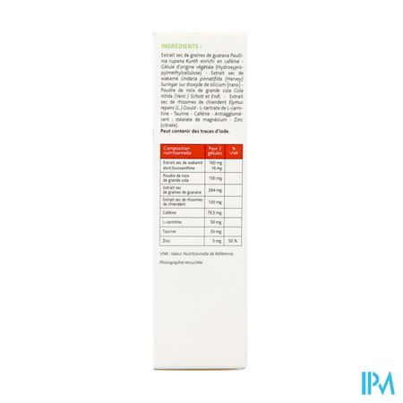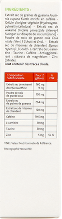 Droog extract van guaranazaden Paullinia cupana Kunth, verrijkt met cafeïne - Gel van plantaardige oorsprong (hydroxypropylmethylcellulose) - Droog extract van wakame Undaria pinnatifida (Harvey) Suringar op siliciumdioxide [nano] - Extract van de grote kolanoot Cola nitida (Vent.) Schott et Endl. - Droog extract van Elymus repens (L.) Gould wortelstokken - L-carnitine L-tartraat - Taurine - Cafeïne - Antiklontermiddel: magnesiumstearaat - Zink (citraat).