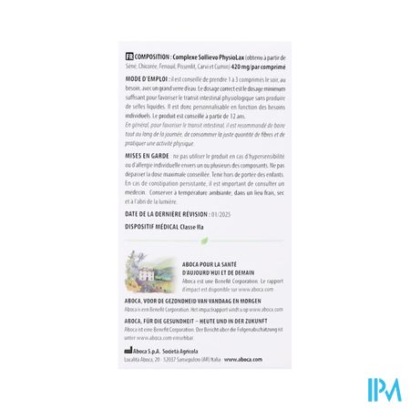 Sollievo Physiolax Tabl 90 is een voedingssupplement, verkrijgbaar in uw buurtapotheek of online apotheek. Neem niet meer dan de aanbevolen dagelijkse dosis vermeld op de verpakking. Het vervangt geen gezonde levensstijl en gevarieerde en evenwichtige voeding. Vraag raad aan uw apotheker. Het product altijd buiten het bereik van kinderen houden.