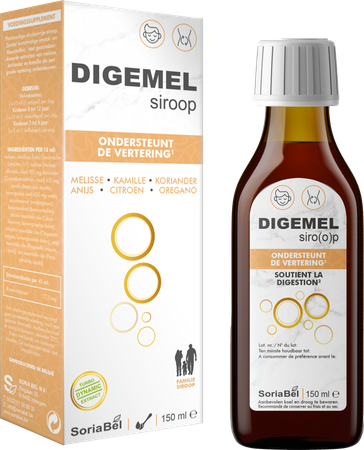 Digemel is een plantaardige alcoholvrije siroop. Zonder kunstmatige smaak- en kleurstoffen. Met gestandaardiseerde extracten van melisse, koriander en kamille die een goede vertering ondersteunen. De siroop bevat tot 2 x meer actieve stoffen door het gebruik van turbo-dynamische extracten.