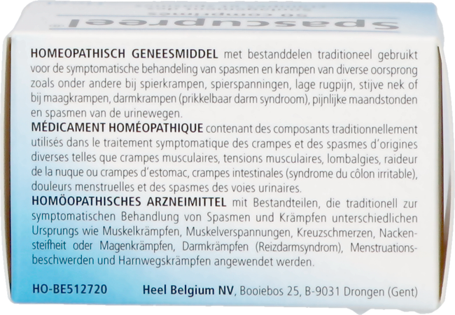 Spascupreel is een homeopathisch geneesmiddel met bestanddelen traditioneel gebruikt voor de symptomatische behandeling van spas- men en krampen van de gladde spieren van het gastro-intestinaal en het urogenitaal stelsel bv. prikkelbare darm syndroom, menstruatie- krampen en spasmen van de urinewegen; en spasmen en krampen van de dwarsgestreepte spieren bv. pijnlijke spanningen in de lage rug, torticollis.