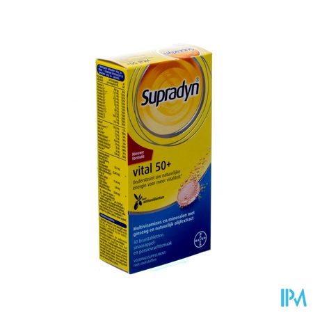 Supradyn Vital 50+ Bruistabletten 30 is een voedingssupplement, verkrijgbaar in uw buurtapotheek of online apotheek. Neem niet meer dan de aanbevolen dagelijkse dosis vermeld op de verpakking. Het vervangt geen gezonde levensstijl en gevarieerde en evenwichtige voeding. Vraag raad aan uw apotheker. Het product altijd buiten het bereik van kinderen houden.