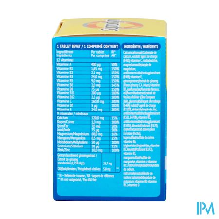 Calciumfosfaat, zwaar magnesiumoxide, L-ascorbinezuur, draagstof (E460i), echte ginseng (Panax ginseng C.A. Meyer), DL-alfa-tocoferylacetaat, nicotinamide, zinkcitraat, ijzer(II)fumaraat, antiklontermiddel (E468), glansmiddelen (E470b, E464), D-biotine, calcium-D-pantothenaat, retinylpalmitaat, glansmiddel (E553b), antiklontermiddel (E551), kleurstof (E171), mangaansulfaat, pyridoxinehydrochloride, riboflavine, koper(II)sulfaat, thiaminemononitraat, cholecalciferol, cyanocobalamine, glansmiddel (E463), kaliumjodide, kleurstof (E141ii), pteroylmonoglutaminezuur, chroom(III)chloride, natriummolybdaat, natriumselenaat.
