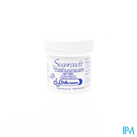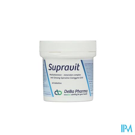 Supravit is een multivitaminen-mineralen preparaat die uw algemene tekorten aan vitaminen en mineralen aanvult. Een dagelijkse aanvulling met Supravit is dan ook primordiaal voor een goede energiehuishouding. Dit hooggedoseerd multivitaminen-mineralen complex is aangevuld met extra Ginseng, Coenzyme Q10 en Spirulina. Ook sporters hebben veelal nood aan een extra aanvulling om topprestaties te kunnen leveren.