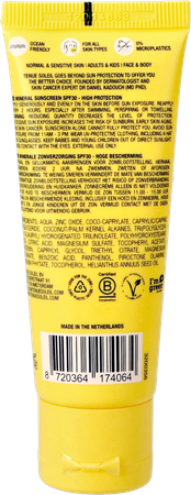 Aqua, Zinkoxide, Coco-Caprylate, Caprylic/Capric Triglyceride, Kokosnoot/Palm Kernel Alkanes, Tri(Polyglyceryl-3/Lauryl) Hydrogenated Trilinoleate, Polyhydroxystearic Acid, Citroenzuur, Magnesiumsulfaat, Magnesiumstearaat, Tocoferylacetaat, Glycerine, Caprylyl Glycol, Triethylcitraat, Benzoëzuur, Panthenol, Piroctone Olamine, Natriumfytaat, Tocoferol.