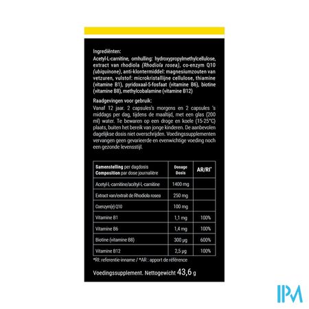 • 250 mg gestandaardiseerd, "adaptogeen" extract van Rhodiola rosea (3% rosavin, 1% salidroside)