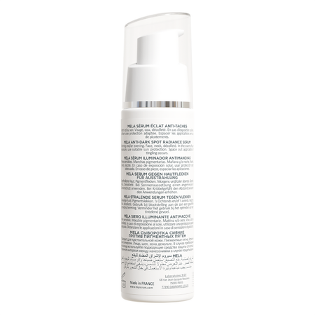 MELA Serum Eclat Anti-Vlekken corrigeert vlekken en voorkomt hun verschijnen voor een meer egale huid vanaf 7 dagen. Dankzij de combinatie van het gepatenteerde MELA-complex en schisandra-bes met een nieuwe, innovatieve werking op de melanogenese-inductoren, biedt dit Anti-Vlekken Serum een intensieve correctie van alle soorten pigmentvlekken, egaliseert het de teint en herstelt het de glans. De frisse, ultralichte en vloeibare textuur hydrateert de huid en is zeer aangenaam aan te brengen.