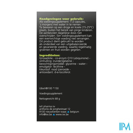 Ubixx 100 Caps 150 is een voedingssupplement, verkrijgbaar in uw buurtapotheek of online apotheek. Neem niet meer dan de aanbevolen dagelijkse dosis vermeld op de verpakking. Het vervangt geen gezonde levensstijl en gevarieerde en evenwichtige voeding. Vraag raad aan uw apotheker. Het product altijd buiten het bereik van kinderen houden.