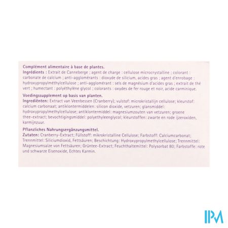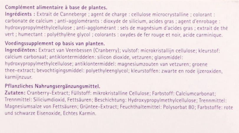Extract van Veenbessen (Cranberry) (500mg); vulstof: microkristallijn cellulose; kleurstof: calcium carbonaat; antiklontermiddelen: silicon dioxide, vetzuren; glansmiddel: hydroxypropylmethylcellulose; antiklontermidel: magnesiumzouten van vetzuren; groene thee-extract; bevochtingsmiddel: polyethyleenglycol; kleurstoffen: zwarte en rode ijzeroxiden, karmijnzuur.