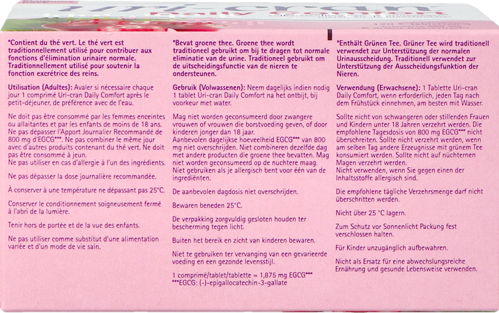 Uri-cran Daily Comfort Tabl 120 is een voedingssupplement, verkrijgbaar in uw buurtapotheek of online apotheek. Neem niet meer dan de aanbevolen dagelijkse dosis vermeld op de verpakking. Het vervangt geen gezonde levensstijl en gevarieerde en evenwichtige voeding. Vraag raad aan uw apotheker. Het product altijd buiten het bereik van kinderen houden.