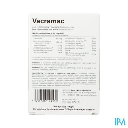 Vacramac 10 Caps 10 Nutriphyt is een voedingssupplement, verkrijgbaar in uw buurtapotheek of online apotheek. Neem niet meer dan de aanbevolen dagelijkse dosis vermeld op de verpakking. Het vervangt geen gezonde levensstijl en gevarieerde en evenwichtige voeding. Vraag raad aan uw apotheker. Het product altijd buiten het bereik van kinderen houden.