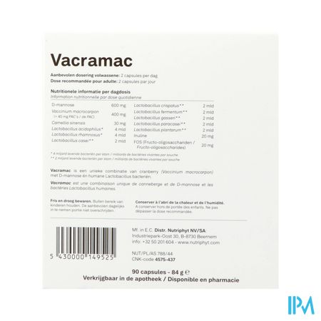 Vacramac is een innovatief voedingssupplement dat op natuurlijke wijze ondersteuning biedt aan de gezondheid van de urinewegen, blaasfunctie en vaginale flora. De formule bevat een unieke combinatie van cranberry-extract, D-mannose, Matcha groene thee, voedingsvezels en een geavanceerd bacteriecomplex met 8 lactobacillen, waaronder de belangrijke Lactobacillus crispatus.