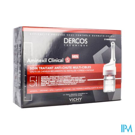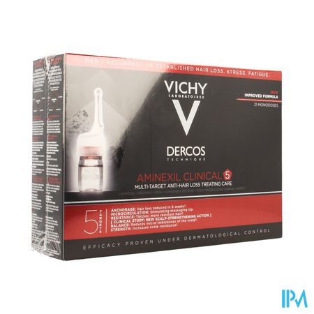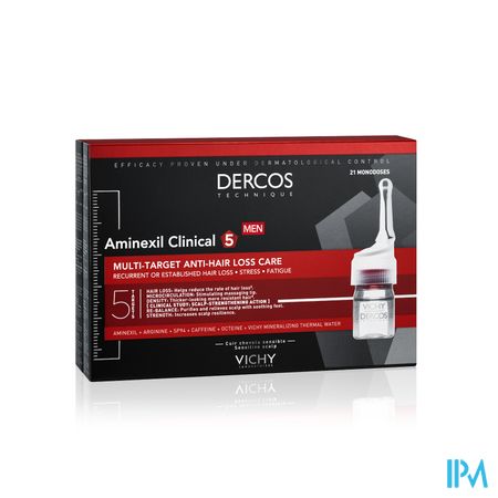Dercos Technique Aminexil Clinical 5 Men is een gerichte kuur tegen haaruitval om haarverlies binnen 6 weken af te remmen. Deze kuur tegen haaruitval bij mannen pakt 5 punten aan: verankering, microcirculatie, weerstand, balans en kracht. Aminexil Clinical 5 bevat een unieke formulering verrijkt met Aminexil, een referentiemolecule op het gebied van producten tegen haaruitval met een klinisch bewezen efficiëntie en een complete werking. De behandeling biedt een optimale tolerantie, is hypoallergeen en is getest op gevoelige hoofdhuid.