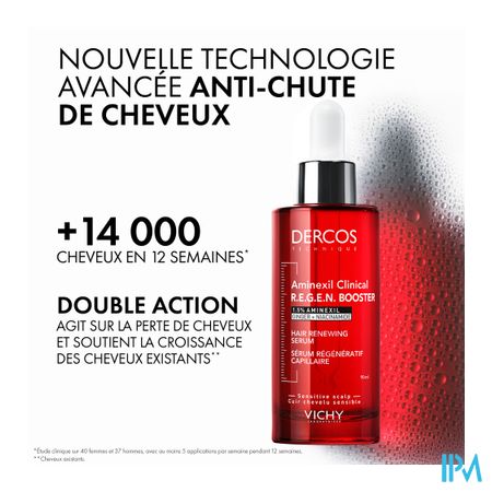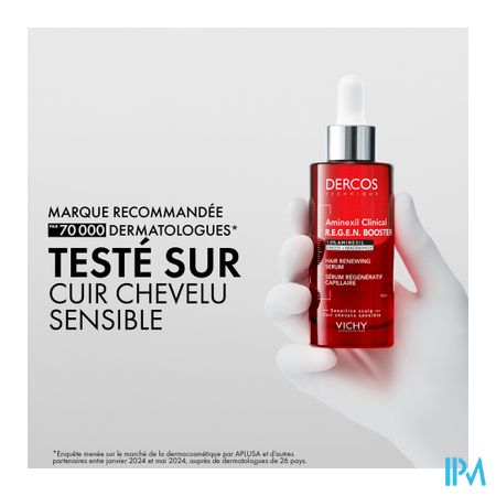 Vichy Dercos Aminexil Clinical R.E.G.E.N. Booster Serum is een geavanceerd haarserum dat haaruitval helpt verminderen en de haargroei stimuleert*. De formule combineert 1,5% Aminexil met gemberextract en niacinamide voor een dubbele werking: het ondersteunt de verankering van het haar in de hoofdhuid en bevordert een gezonde haargroei*. Het serum versterkt de haarvezel, geeft meer volume en glans, en draagt bij aan een vollere haardos. Geschikt voor dagelijks gebruik op droog of vochtig haar, voor zichtbaar sterker en vitaler haar. Vichy Dercos Aminexil Clinical R.E.G.E.N. Booster Serum biedt een gerichte aanpak bij haaruitval en dunner wordend haar. De combinatie van Aminexil, gemberwortel en niacinamide helpt de haarwortel te beschermen, stimuleert de hoofdhuid en ondersteunt de natuurlijke haargroei. Dit anti-haaruitval serum voedt en versterkt het haar vanaf de aanzet, waardoor het er voller en gezonder uitziet. Voor het beste resultaat wordt aangeraden het product 5 tot 7 keer per week aan te brengen, verdeeld over vier secties van de hoofdhuid. Ideaal in combinatie met Dercos shampoo voor een complete haarverzorgingsroutine. *Bestaand haar.