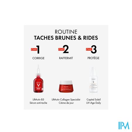 Met de leeftijd en externe schadelijke factoren, zoals vervuiling en UV-stralen, kunnen er pigmentvlekken, rimpels en een onregelmatige teint ontstaan. De oplossing van Vichy: Liftactiv Specialist B3 Serum, een innovatief serum dat deze zichtbare tekenen helpt te verminderen. Het werkt op verschillende niveaus van de huid om de vorming van pigmentvlekken op de bovenste laag van de opperhuid te helpen voorkomen. Tegelijkertijd exfolieert het B3 serum de vlekken die zichtbaar zijn aan het huidoppervlak en vermindert het ook rimpels. De huid is egaler en stralender.