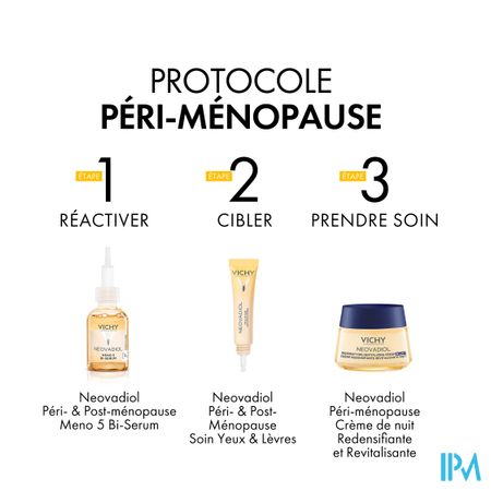 Breng 's avonds aan op het gezicht, de kaaklijn en de hals, vermijd de zone rond de ogen, breng aan na de Meno 5 Bi-Serum. Vermijd de zone rond de ogen.