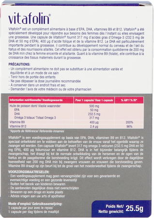 Vitafolin® is speciaal ontwikkeld om te voorzien in de behoeften van vrouwen wanneer ze een zwangerschap overwegen, tijdens de zwangerschap en tijdens het geven van borstvoeding. DHA is vooral belangrijk tijdens de zwangerschap, omdat het bijdraagt aan de normale ontwikkeling van de hersenen en de ogen van de foetus en van zuigelingen die borstvoeding krijgen. Dit effect wordt bereikt door tijdens de zwangerschap en borstvoeding ten minste 200 mg DHA per dag te consumeren. Vitamine B9 (folaat) draagt bij aan de groei van het moederlijk weefsel tijdens de zwangerschap.