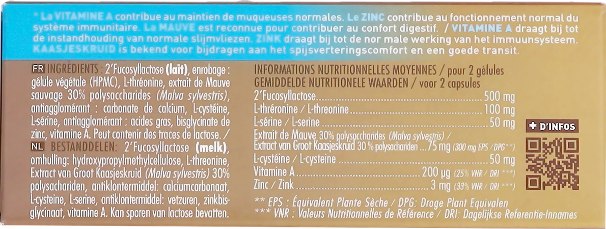 Dit voedingssupplement verrijkt met 2'-Fucosyllactose helpt u de balans van uw darmbarrière te herstellen. Onze formule bevat bovendien L-cysteïne, L-serine en vitamine A, die bijdragen aan het behoud van normale slijmvliezen. Zink draagt op zijn beurt bij aan de normale werking van het immuunsysteem.
