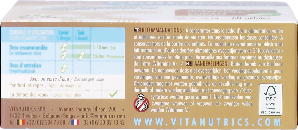 Te gebruiken als onderdeel van een gevarieerde en evenwichtige voeding en een gezonde levensstijl. De aanbevolen dosering niet overschrijden. Buiten bereik van kinderen houden. Dit product mag niet worden gebruikt als u op dezelfde dag moedermelk of andere voedingsmiddelen met toegevoegde 2'-fucosyllactose consumeert. Niet aanbevolen voor zwangere vrouwen of vrouwen die van plan zijn zwanger te worden (vitamine A).