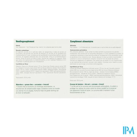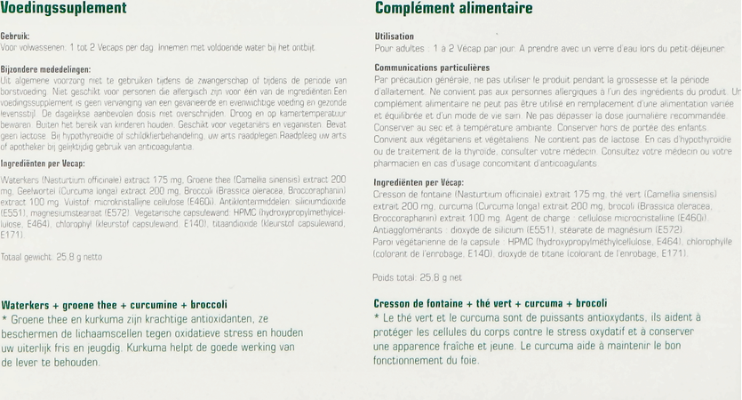 Waterkers (Nasturtium officinale) extract 175 mg, Groene thee (Camellia sinensis) extract 200 mg, Geelwortel (Curcuma longa) extract 200 mg, Broccoli (Brassica oleracea, Broccoraphanin) extract 100 mg. Vulstof: microkristallijne cellulose (E460i). Antiklontermiddellen: siliciumdioxide (E551), magnesiumstearaat (E572). Vegetarische capsulewand: HPMC (hydroxypropylmethylcellulose (E464), clorophyl (kleurstof capsulewand (E140)), titaandioxide (kleurstof capsulewand, E171).