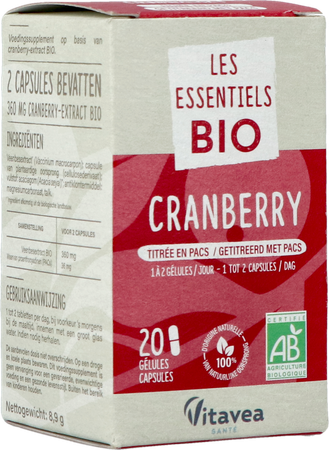 Cranberry Bio VITAVEA Bien-être is een voedingssupplement. De 100% natuurlijke en biologische formule bevat een actieve stof die erkend en geprezen is om zijn flavonoïden (PAC's).
