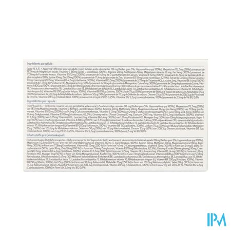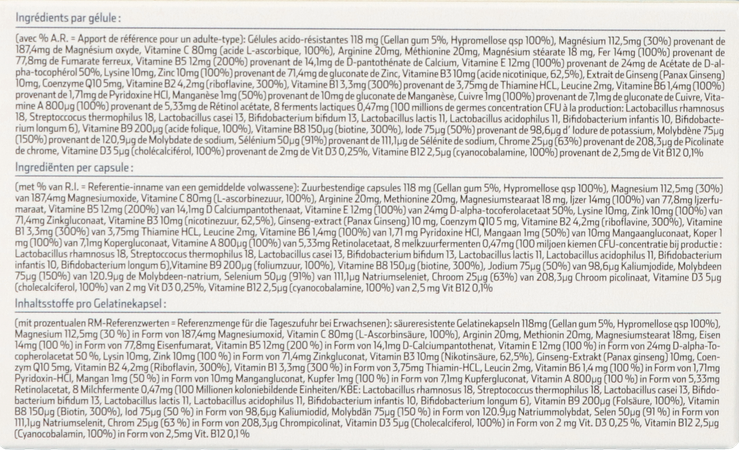 (met % R.I. = Referentie Inname voor een gemiddelde volwassene): Zuurbestendige capsules 118mg (Gellan gom 5%, Hypromellose qsp 100%), Magnesium 112,5mg (30%) van187,4mg Magnesiumoxide, Vitamine C 80mg (L-ascorbinezuur, 100%), Arginine 20mg, Methionine 20mg, Magnesiumstearaat 18 mg, IJzer 14mg (100%) van77, 8mg Ferro Fumaraat, Vitamine B5 12mg (200%) uit 14,1mg Calcium D-Pantothenaat, Vitamine E 12mg (100%) uit 24mg D-alfa tocoferol acetaat 50%, Lysine 10mg, Zink 10mg (100%) uit 71,4mg Zink Gluconaat, Vitamine B3 10mg (Nicotinezuur, 62,5%), Ginsengextract (Panax Ginseng) 10mg, Co-enzym Q10 5mg, Vitamine B2 4,2mg (Riboflavine, 300%), Vitamine B1 3,3mg (300%) uit 3,75mg Thiamine HCL, Leucine 2mg, Vitamine B6 1,4mg (100%) uit 1,71mg Pyridoxine HCl, Mangaan 1mg (50%) van 10mg mangaan-gluconaat, koper 1mg (100%) van 7,1mg kopergluconaat, vitamine A 800μg (100%) van 5,33mg retinol-acetaat, 8 melkzuurbacteriën 0,47mg (100 miljoen kiemconcentratie CFU bij productie: Lactobacillus rhamnosus 18, Streptoccocus thermophilus 18, Lactobacillus casei 13, Bifidobacterium bifidum 13, Lactobacillus lactis 11, Lactobacillus acidophilus 11, Bifidobacterium infantis 10, Bifidobacteriumlongum 6), Vitamine B9 200μg (foliumzuur, 100%), Vitamine B8 150μg (biotine, 300%), Jodium 75μg (50%) uit 98,6μg kaliumjodide, Molybdeen 75μg (150%) uit 120,9μg natriummolybdaat, Selenium 50μg (91%) uit 111,1μg natriumseleniet, Chroom 25μg (63%) uit 208, 3μg chroompicolinaat, Vitamine D3 5μg (cholecalciferol, 100%) uit 2mg Vit D3 0,25%, Vitamine B12 2,5μg (cyanocobalamine, 100%) uit 2,5mg Vit B12 0,1%.