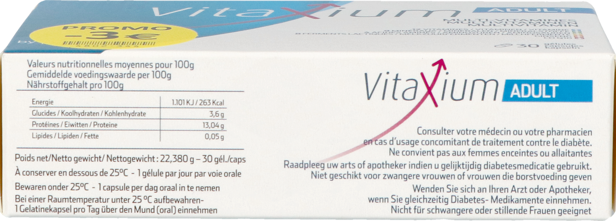 Vitaxium Adult Multi Vitamines Caps 30 Promo -3€ is een voedingssupplement, verkrijgbaar in uw buurtapotheek of online apotheek. Neem niet meer dan de aanbevolen dagelijkse dosis vermeld op de verpakking. Het vervangt geen gezonde levensstijl en gevarieerde en evenwichtige voeding. Vraag raad aan uw apotheker. Het product altijd buiten het bereik van kinderen houden.