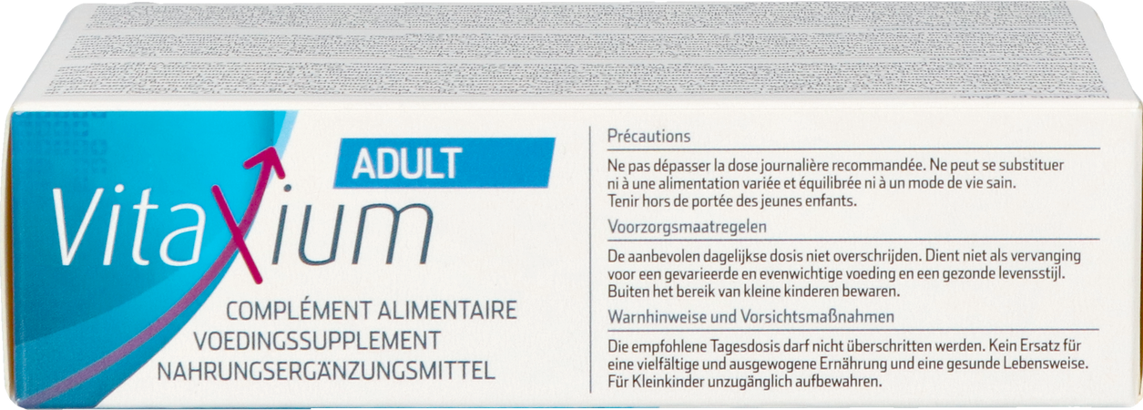 WAT IS VITAXIUM ADULT? Vitaxium Adult is een voedingssupplement dat u helpt uw energieniveau weer op te krikken, tijdens tijdelijke vermoeidheid of veeleisende periodes, en u de dagelijkse verplichtingen van het leven met vertrouwen tegemoet laat zien.