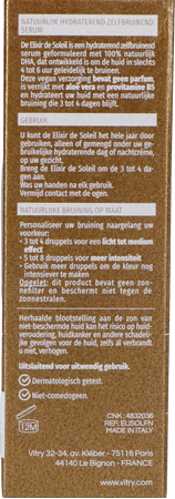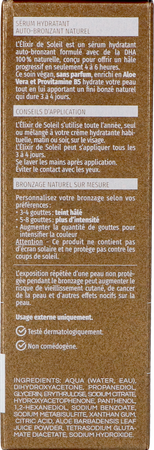 Profiteer van een opbouwbare en progressieve bruine kleur zonder zon gedurende 5 tot 7 dagen. U kunt de Elixir de Soleil alleen aanbrengen of gemengd met uw crème voor een uniform resultaat zonder een oranje finish. Een 2in1 serum , hydraterend en zelfbruinend voor een gehydrateerde en stralende huid!