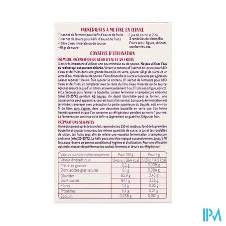 Neem onmiddellijk na het overgieten de 250 ml die overblijft op de bodem van de eerste fles en voeg dezelfde hoeveelheden suiker, citroensap en schijfjes, gedroogd fruit, enz. opnieuw toe om opnieuw te gisten bij kamertemperatuur (minstens 20- 25°C). Kefir kan tot 10 keer na elkaar opnieuw geproduceerd worden, op voorwaarde van goede hygiëne en gebruiksomstandigheden. Voor een optimale doeltreffendheid bewaar je de zakjes gist en fermenten best in de koelkast.