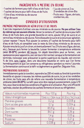 voor water- en fruitkefir toe en vul aan met de rest van de liter mineraal- of bronwater. Voeg vervolgens het sap van een citroen en 1 of 2 gedroogde vruchten (vijg, abrikoos, enz.) toe. Schud en sluit de fles. Laat 48 uur gisten bij kamertemperatuur (min. 20-25°C). Er kan zich een witachtige neerslag vormen en een opalescentie verschijnen. Als de gisting klaar is, giet je de bovenste ¾ liter vloeistof voorzichtig, zonder te schudden, over in een tweede glazen fles, sluit je hem goed af en zet je hem minstens 1 dag in de koelkast. De fermentatie gaat door en de kefir zal licht koolzuurhoudend worden. Geniet gekoeld.