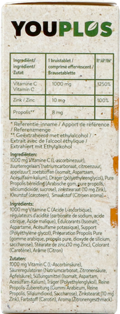 Youplus Vitamine C Zink Propolis is een voedingssupplement. Het bruistablet, dat behoort tot de vitamines die in het water worden gegooid, biedt voordelen met vitamine C, zink en zuivere propolis. Dankzij het vitamine C-gehalte draagt het bij aan de vermindering van vermoeidheid en moeheid en de normale werking van het immuunsysteem. Met zink ondersteunt het het normale macronutriëntenmechanisme.