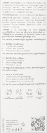 ZARQA Handcrème is een intensief hydraterende en beschermende handcrème voor droge, ruwe en gevoelige handen. Het bevat 5% urea en panthenol. De crème trekt snel in. Handen voelen na gebruik weer soepel en glad aan.