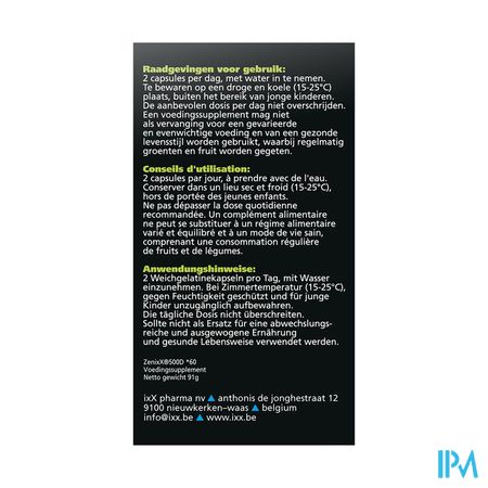 Zenixx 500 D Caps 60 is een voedingssupplement, verkrijgbaar in uw buurtapotheek of online apotheek. Neem niet meer dan de aanbevolen dagelijkse dosis vermeld op de verpakking. Het vervangt geen gezonde levensstijl en gevarieerde en evenwichtige voeding. Vraag raad aan uw apotheker. Het product altijd buiten het bereik van kinderen houden.