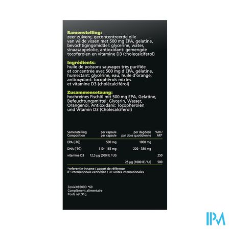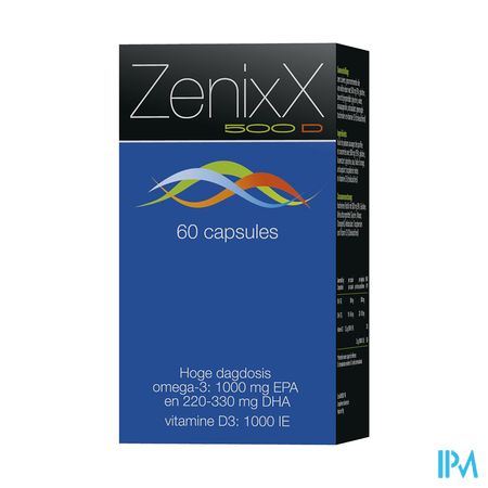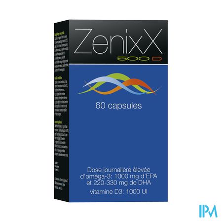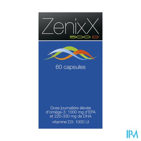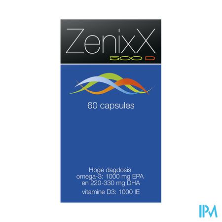 2 zachte capsules ZenixX 500 D bevatten minstens 1000 mg EPA (gemiddeld 1050 mg), 320 mg DHA en 1000 IE vitamine D3 (25 µg).