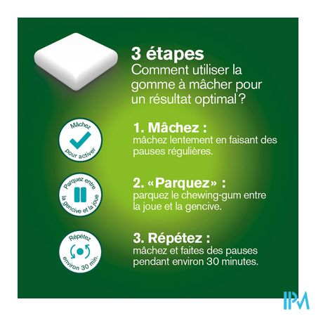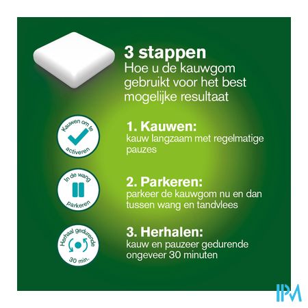 Kauw langzaam gedurende 10 seconden, laat vervolgens gedurende één minuut de Nicorette® Freshmint Kauwgom tussen tandvlees en wang rusten. Herhaal dit gedurende zo'n dertig minuten.