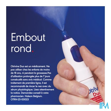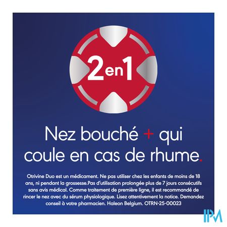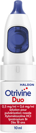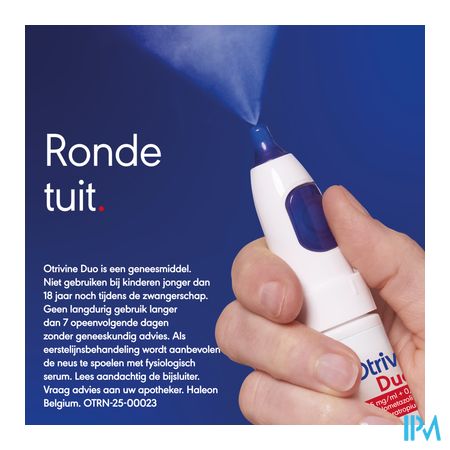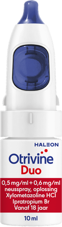 Otrivine Duo is een combinatiegeneesmiddel dat uit twee verschillende bestanddelen bestaat. Eén van de actieve bestanddelen helpt tegen lopende neus, het andere bestanddeel heeft een ontzwellend effect. Otrivine Duo wordt gebruikt voor de behandeling van neusverstopping met lopende neus (rinorree) in verband met neusverkoudheid. Duur van de behandeling: 1 ml bevat/contient/enthält: xylometazoline hydrochloride 0,5 mg, ipratropium bromide 0,6 mg. 1 verstuiving/ pulvérisation/ Sprühstoß bevat/contient/enthält: 70 microgram xylometazoline hydrochloride, 84 microgram ipratropium bromide. Disodium edetate, glycerol (85%), purified water, hydrochloric acid and sodium hydroxide (for pH-adjustment) Volwassenen (ouder dan 18 jaar): Eén verstuiving in elk neusgat, niet meer dan 3 maal per dag en niet langer dan 7 dagen. Een tussentijd van minstens 6 uur tussen twee toedieningen in acht nemen. Nasaal gebruik. Lees voor het gebruik de bijsluiter. Buiten het zicht en bereik van kinderen houden. Vrije aflevering. Bewaren beneden 25 °C.Omschrijving